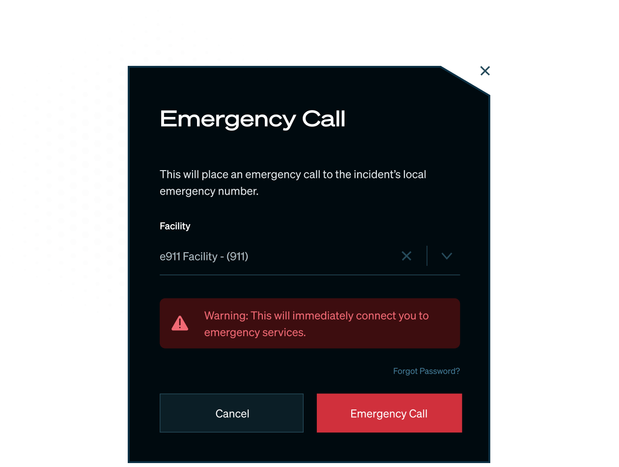 When an incident escalates, operators can call 911 directly from the platform. The call routes to the correct jurisdiction based on incident location automatically — no tracking down the right dispatch center under pressure. A configurable callback number ensures continuity if the call drops, and every emergency call is logged with time, operator, duration, and facility for a complete record.